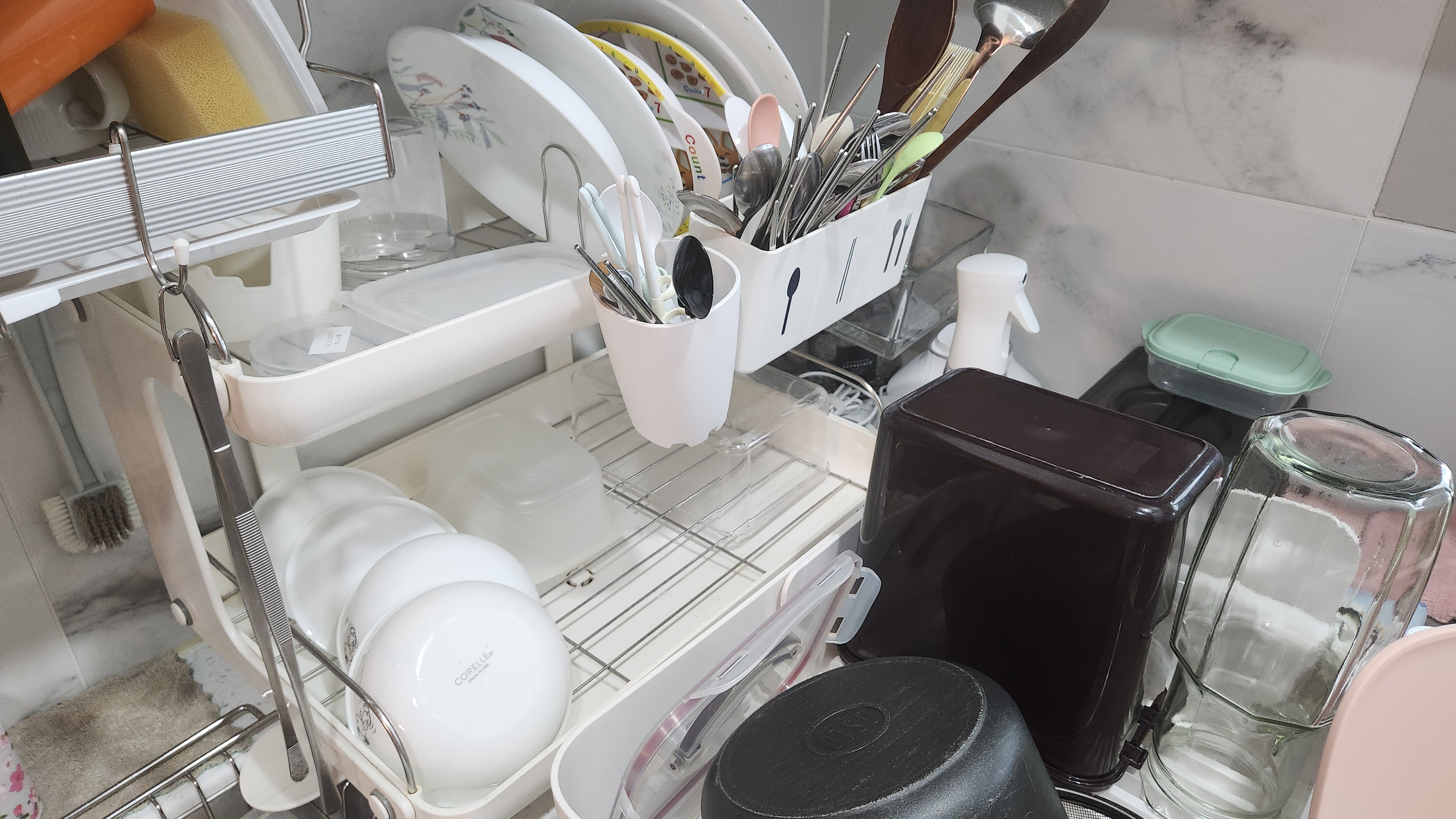 컵걸이와 걸이형 수저통이 있어서 올스텐 루시드 식기건조대 하나만 있어도 식기정리가 가능합니다.